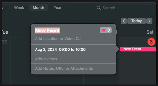EKEvent에 어떤 속성들이 필요할지는, 다음과 같이 기본 캘린더 앱에서 생성 시 나타나는 요소들을 생각해 보면 이해하기 쉽다