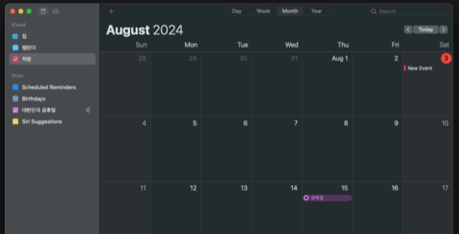 기본 캘린더 앱을 보면 다음과 같이 여러 캘린더가 존재하고, 좌측에서 캘린더를 선택하여 관련 이벤트만 볼 수 있다