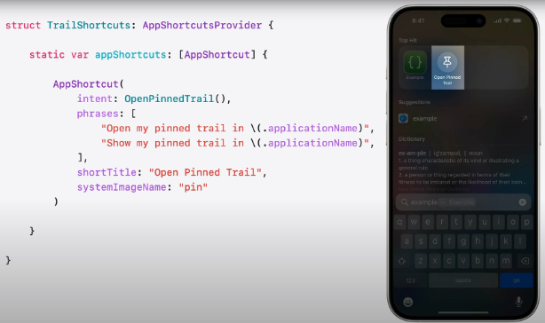 - Actions 정의: 앱의 기능을 시스템에 알려주는 역할, 이를 통해 Siri나 Spotlight가 앱의 기능을 인식하고 사용자에게 제공할 수 있다
